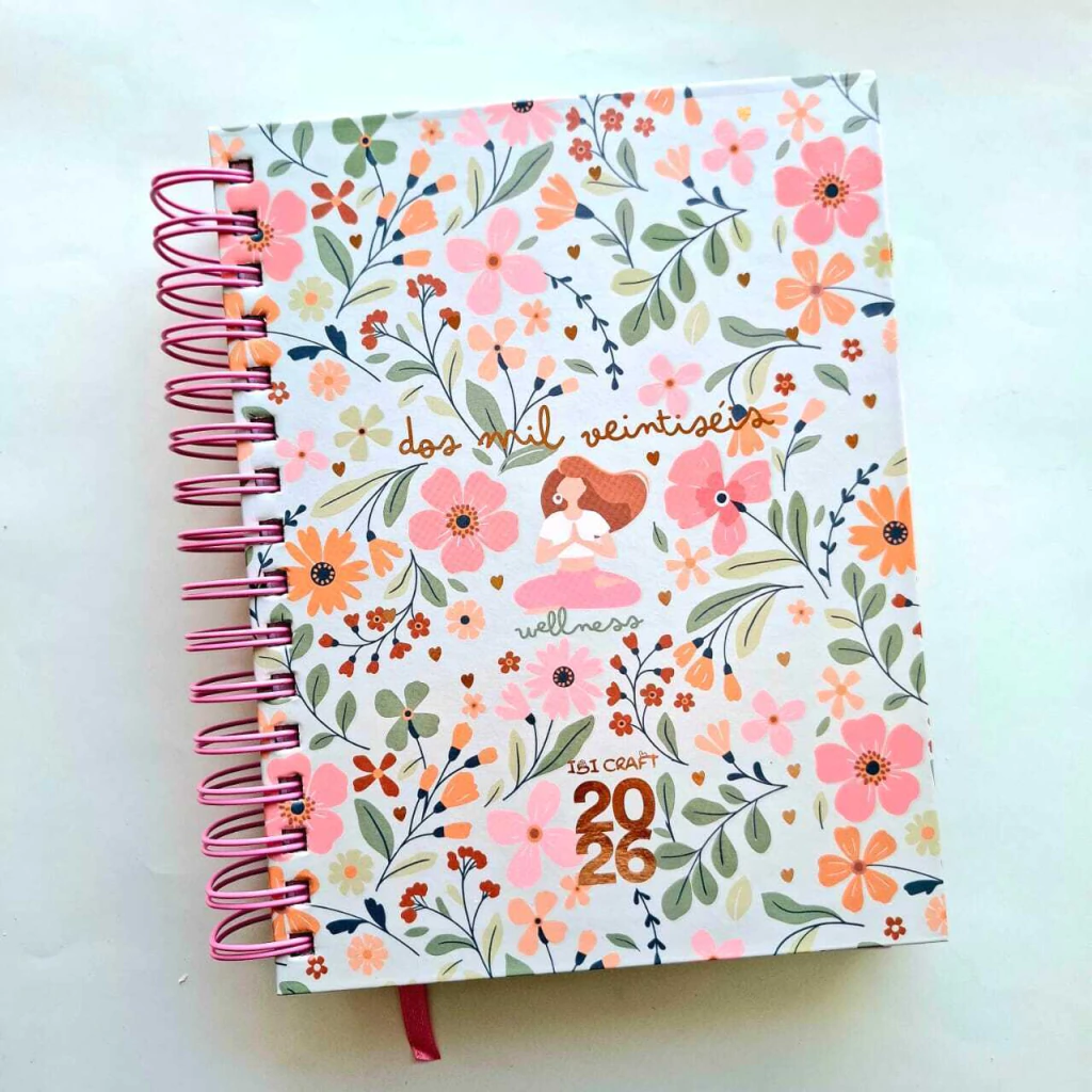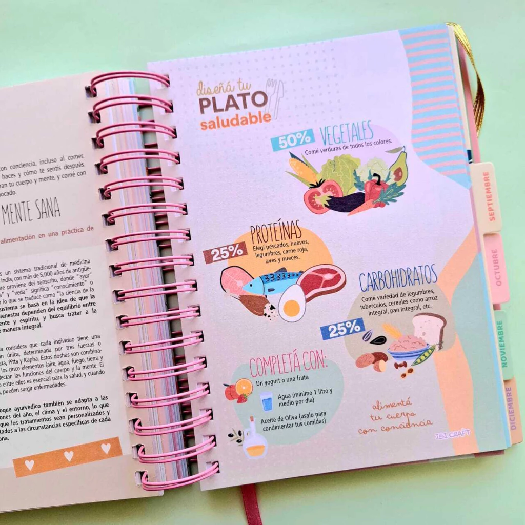 Interior incluye: calendario, balance mensual, tracker de habitos, objetivos, separadores de meses con lengueta, vista diaria con horario, planner mensual, 2 planchas de stickers, hoja troquelada, sobre interno.