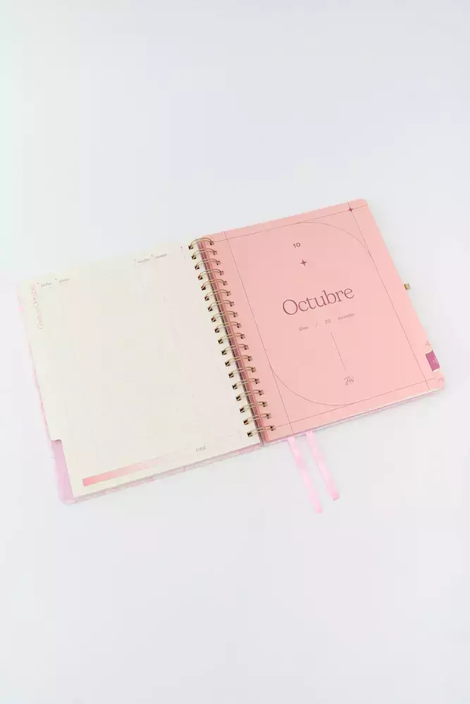 Formato B5 (19x25cm) anillado tapa dura, elastico con dije y señalador
